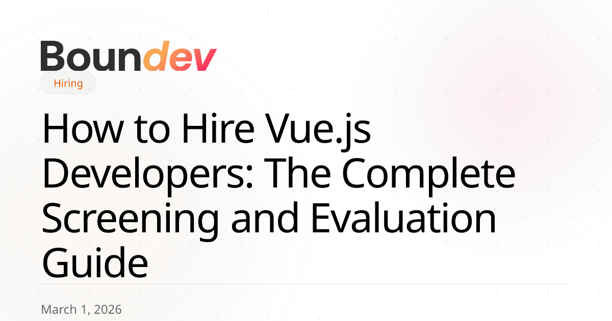 At Boundev, we've placed Vue.js engineers into product teams through staff augmentation — engineers who join your standups, commit to your GitHub, and own features end-to-end. Our screening process is built by engineers, not recruiters, and it evaluates the skills that actually predict production performance. Here's the framework we use.