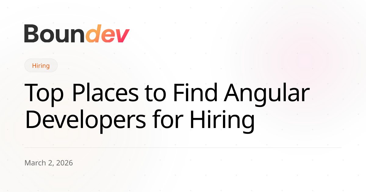The best places to find Angular developers include Boundev for pre-vetted enterprise Angular specialists through staff augmentation, Toptal for elite freelance consulting, Upwork for flexible project-based work, Arc.dev for vetted remote talent, AngularJobs.io for framework-specific job postings, and Stack Overflow Jobs for community-active developers. Developer communities like GitHub Angular repositories, Reddit r/Angular2, and Angular Google Groups are also valuable for discovering skilled developers through their community contributions.